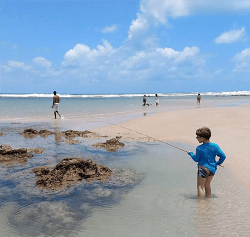 No litoral, o amanhecer colore o céu em tons dourados refletidos no Atlântico, criando o ambiente perfeito para caminhadas na areia e banhos tranquilos.