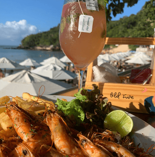 Peixes e frutos do mar frescos servidos em quiosques e restaurantes à beira-mar.